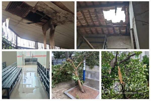 此次台风强度大,导致部分教堂建筑及设施受到不同程度损坏。个别堂点的礼拜堂及附属用房出现屋顶瓦片被掀或破损,部分窗户玻璃在强风中破裂或脱落,一些室内天花板因雨水渗漏或风压影响发生局部脱落。由于风雨强度大、持续时间长,部分场所出现室内积水现象。此外,多个场所周边环境也受到较大影响,多棵树木被强风吹倒或连根拔起,散落在庭院及通道上。