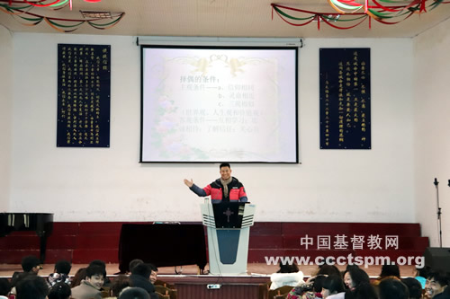 以“圣经中的婚恋原则”为题,靳牧师结合圣经神学的相关内容,阐释了上帝设立婚姻的目的,以及恋爱需要寻求上帝的心意,并以圣洁为原则进行。结合亚当和夏娃、以撒和利百加、波阿斯和路得的具体例证,分析了幸福婚恋离不开上帝的引导和祝福。