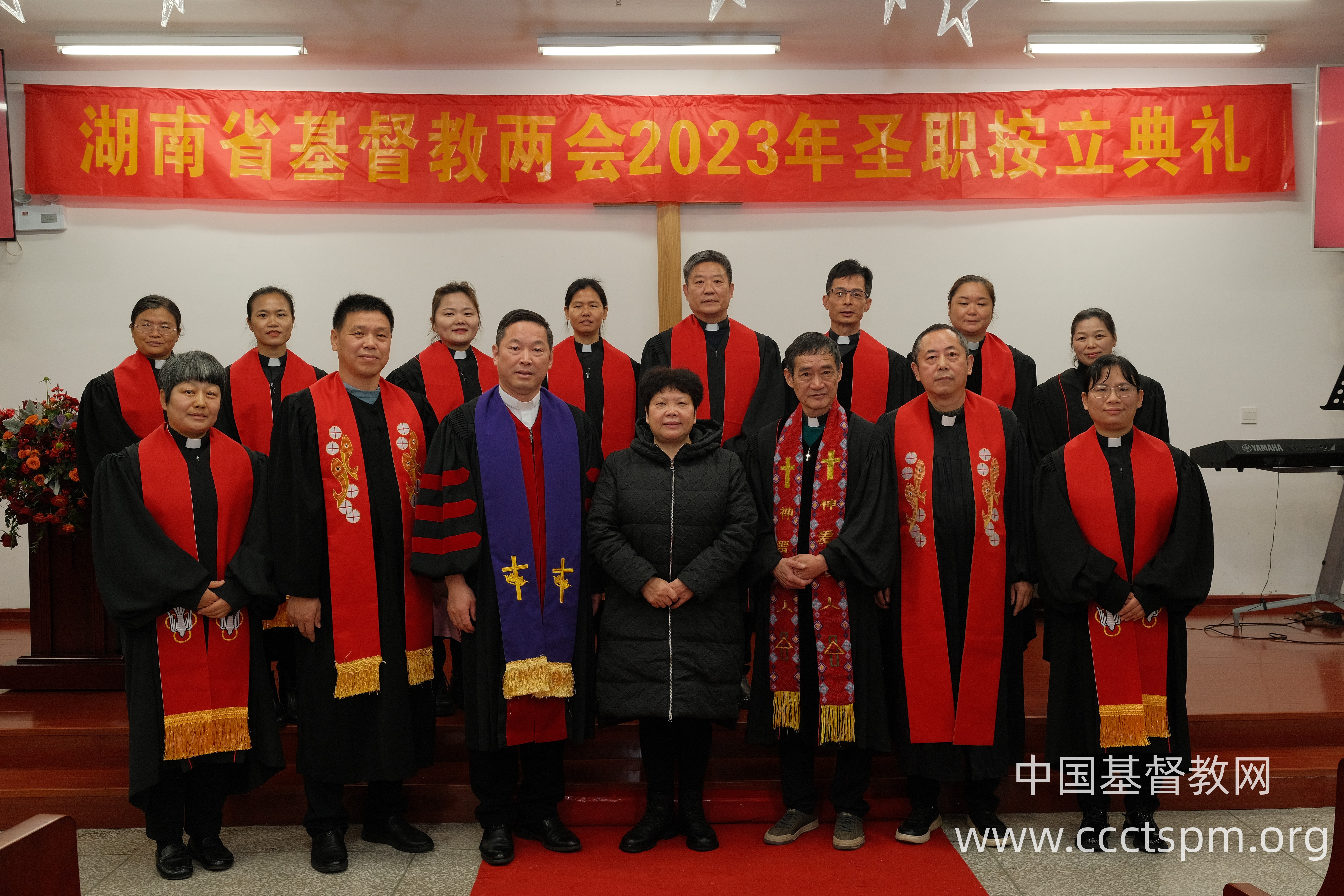12月31日,湖南省基督教两会举行2023年圣职按立典礼,湖南省基督教协会会长杜温武牧师主礼,湖南省基督教协会原会长陈郅牧师、湖南省基督教协会副会长黄克刚牧师、湖南省基督教三自爱国运动委员会秘书长彭佳荣牧师襄礼。