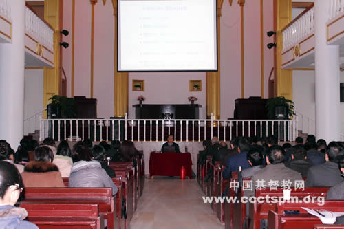 11月15日下午,河南省基督教三自爱国运动委员会秘书长王福增牧师主持开班仪式并代祷,然后省基督教三自爱国运动委员会主席唐卫民牧师以“当前基督教面临的机遇与挑战”为题,作了长达两个小时的讲座。他根据河南基督教会的具体情况,就三个方面分析了当前教会的发展机遇、存在问题以及事工发展方向。他认为,我国对宗教高度重视,“宗教和谐论”的提出标志着宗教在中国的历史地位有了提高,良好的宗教信仰自由政策为河南基督教的发展提供了前所未有的机遇,同时河南教会发展中也存在一些问题,比如私设聚会点问题有待解决,传道员整体素质亟待提高,东方闪电这一邪教正在破坏河南教会。为此,唐牧师认为河南教会急需固本强身,加强自身的思想建设、组织建设和人才建设。