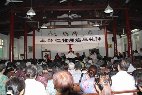 2013年7月3日上午9时30分,王怀仁牧师追思礼拜在西安市南新街礼拜堂举行。古朴的南新街礼拜堂布置庄重,讲台的上方,挂着白底黑字的横幅,上书“王怀仁牧师追思礼拜”;讲台的下边,摆放着两个花篮,上书一副挽联:“弘扬圣道愿负十架”,“效法基督甘为仆人”,花篮之间,摆放着王怀仁牧师的遗像。