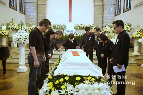 罗保罗牧师的夫人和从海内外赶回来的亲属们围在灵柩周围,向罗牧师作最后的告别。