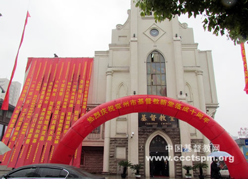 2014年4月26日,江苏常州文化宫广场上彩旗飘舞、乐音阵阵,常州教会的弟兄姊妹欢喜汇聚,共同庆祝常州基督教新堂落成10周年。