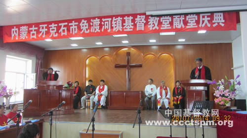 2014年7月27日,内蒙古大兴安岭牙克石市免渡河基督教会举行了隆重的献堂典礼。来自40个堂点的同工及本堂信徒共600多人见证了这一神圣时刻。典礼共分三个部分:献堂洁净礼、献堂崇拜、献堂庆典,分别由呼伦贝尔市基督教两会办公室主任高志刚牧师、市基督教三自爱国运动委员会副秘书长陆诗敏牧师、堂管委会主任张梅华牧师主持。呼伦贝尔市基督教两会主席、会长王丽华牧师向该堂主任牧师行托负礼,并代表市基督教两会讲话。