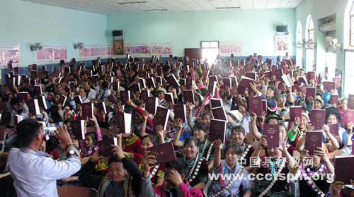 发行仪式结束后,向参加的每位彝族和傈僳族弟兄姊妹赠送一本新出版的圣经。