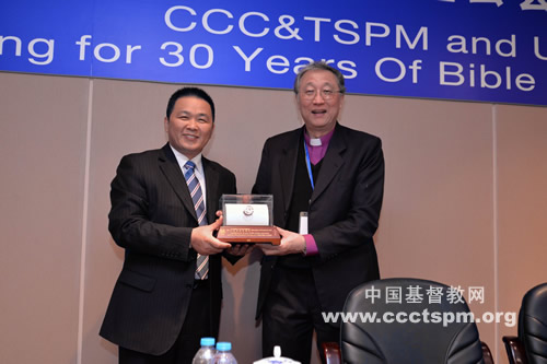 会上,中国基督教协会驻会副会长单渭祥牧师代表中国基督教两会接受了联合圣经公会赠送的礼物——代表着联合圣经公会爱心捐赠的纸张盒。