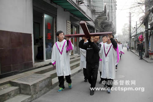 受难日崇拜分十字架行军和十字架七言默想两部分。晚600时十字架行军开始,中南神学院院长汪振仁牧师肩扛十字架,由中南神学院穿过三道街行至湖北省基督教感恩堂,四个年级的学生排着整齐的队伍,低唱《流血歌》紧随其后。